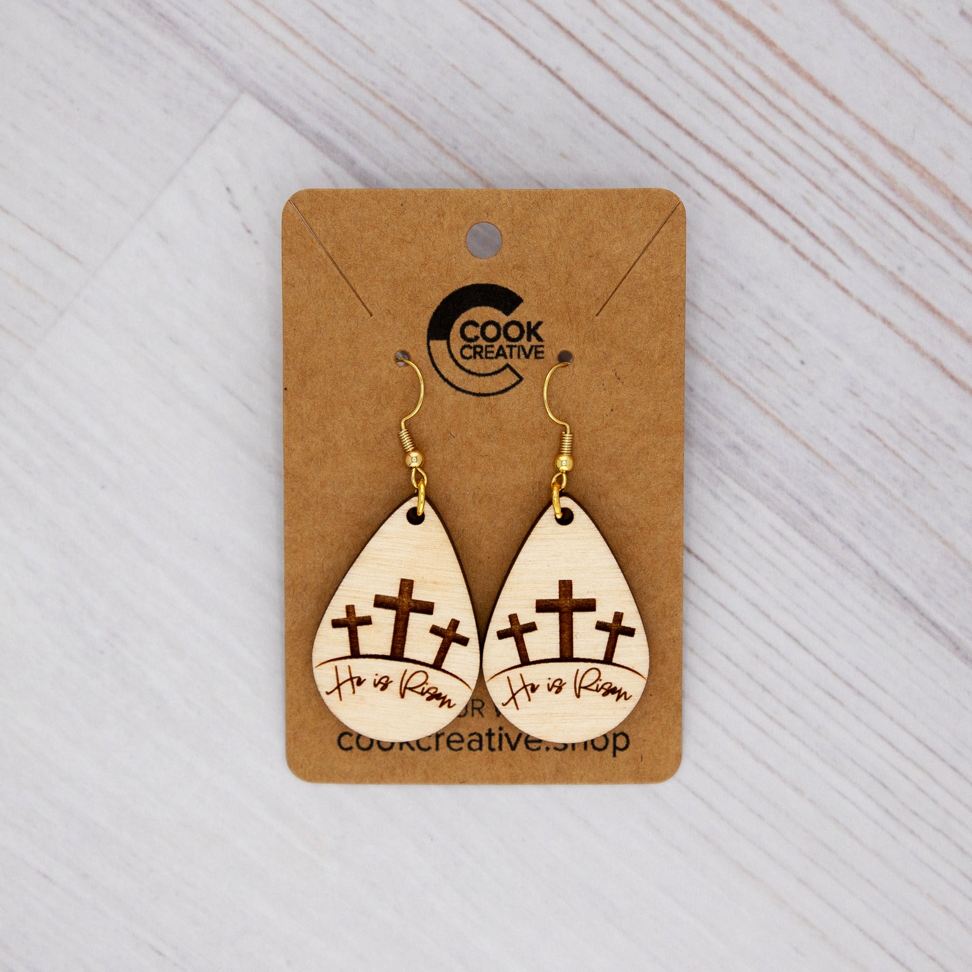 Our He is Risen earrings are crafted from stained Baltic birch wood and feature a stunning gold hook for a touch of elegance.