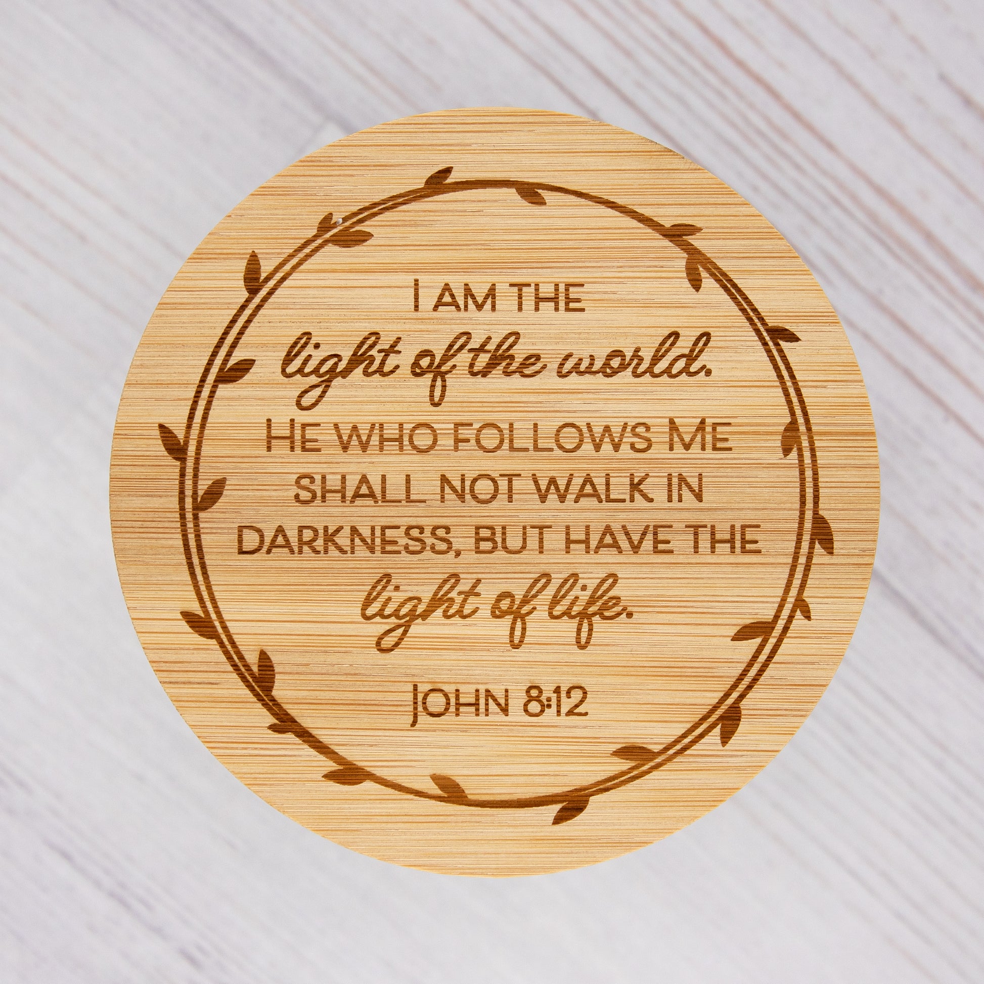 This 16oz glass 2-wick candle with bamboo lid includes a scripture that reads, "I am the light of the world. He who follows Me shall not walk in darkness, but have the light of life. John 8:12". This candle is meant to bring peace and hope for you or a loved one. It is made from hand-poured organic soy wax.
