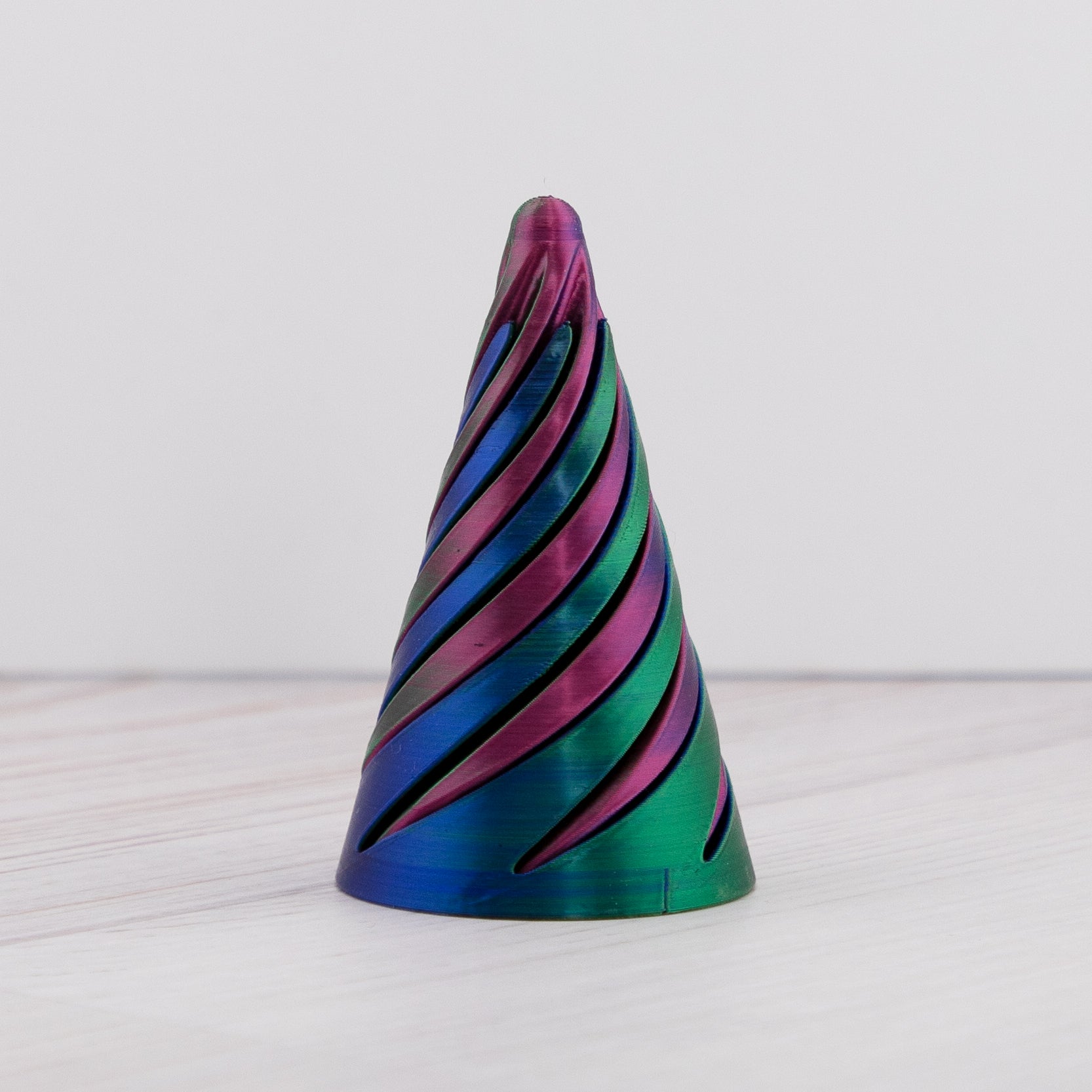 Get ready to add some fun with this 3D-printed spiral tree fidget. Whether you need a calming desk accessory or a fun gift, this unique fidget toy is a perfect choice. This fidget features a satisfying spiral design that spins and rotates as you twist it. The smooth, fluid motion is mesmerizing and helps relieve stress or keep your hands busy during long work or study sessions. Due to filament colors on hand and variations in color, the colors in the tree fidget you receive may vary.